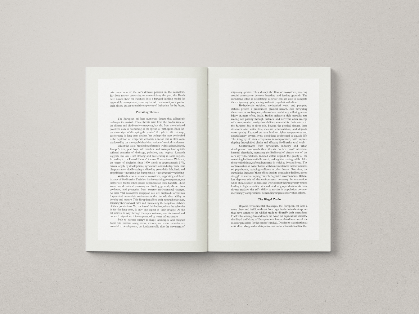 This commemorative coffee table book marks fifteen years of operations for the Sustainable Eel Group, mapping its influence in European policy, environmental protection, and academic research. The typography, set in three Baskerville variants, provides for an authoritative yet approachable tone, reinforcing the significance of the subject matter. The spacious page margins have the appearance of frames which can be colourised or negated to define the significance of text and image. The narrative follows a clear, chronological sequence, maintaining a measured peace that allows each milestone, challenge, and success to unfold gradually. The result is a collectible artefact which balances quality copy with high-resolution archive photography to instil confidence in future projects to ‘accelerate the eel’s recovery’.